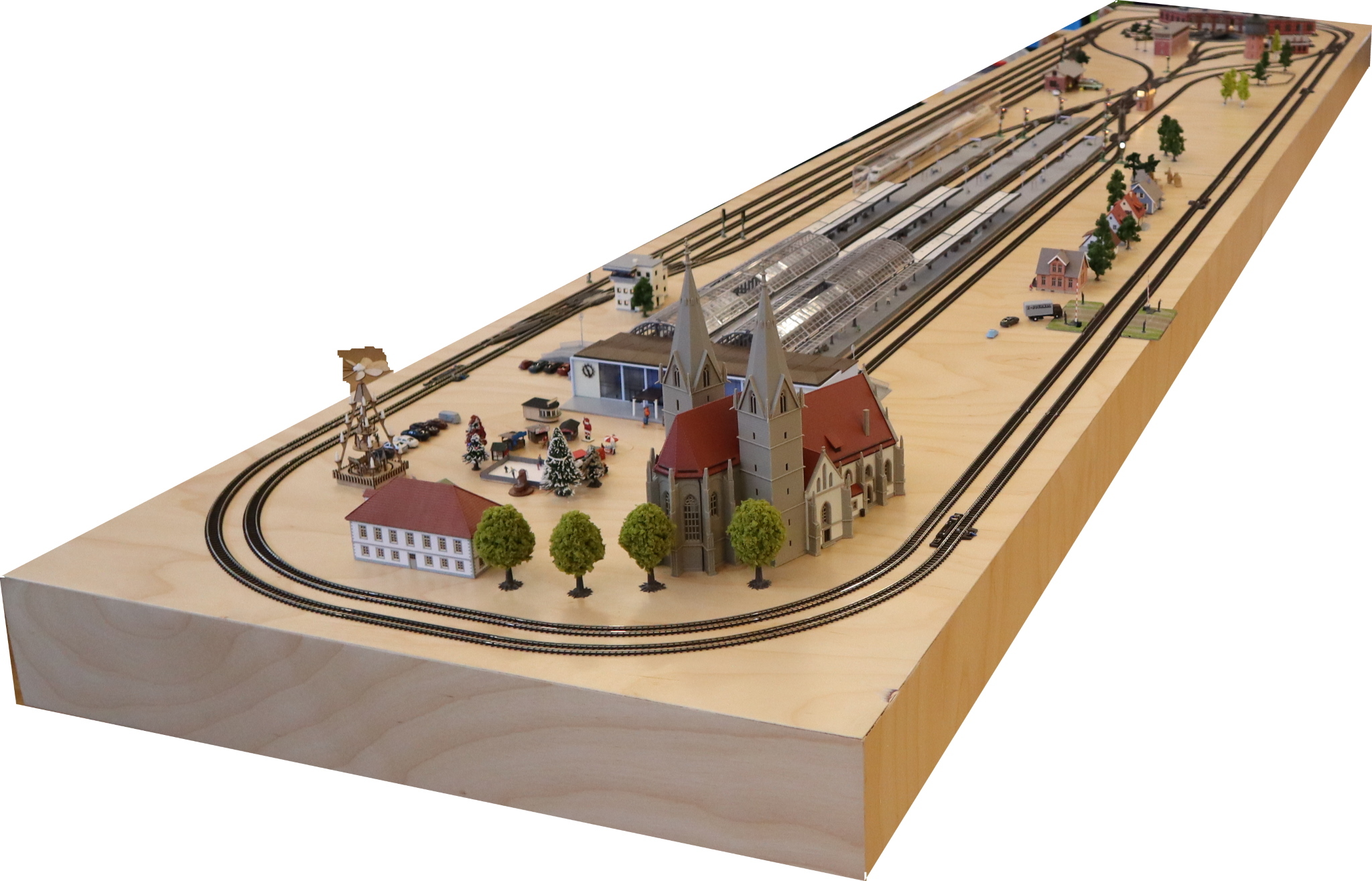 das ist meine Anlage „Dingenskirchen“. Sie hat jetzt in Zell Uraufführung und ist bisher unveröffentlicht. Vor 2wei Jahren habe ich mit dem Bau begonnen und jetzt endlich auf die Zeller Ausstellung hin die letzten Kinderkrankheiten beseitigt.