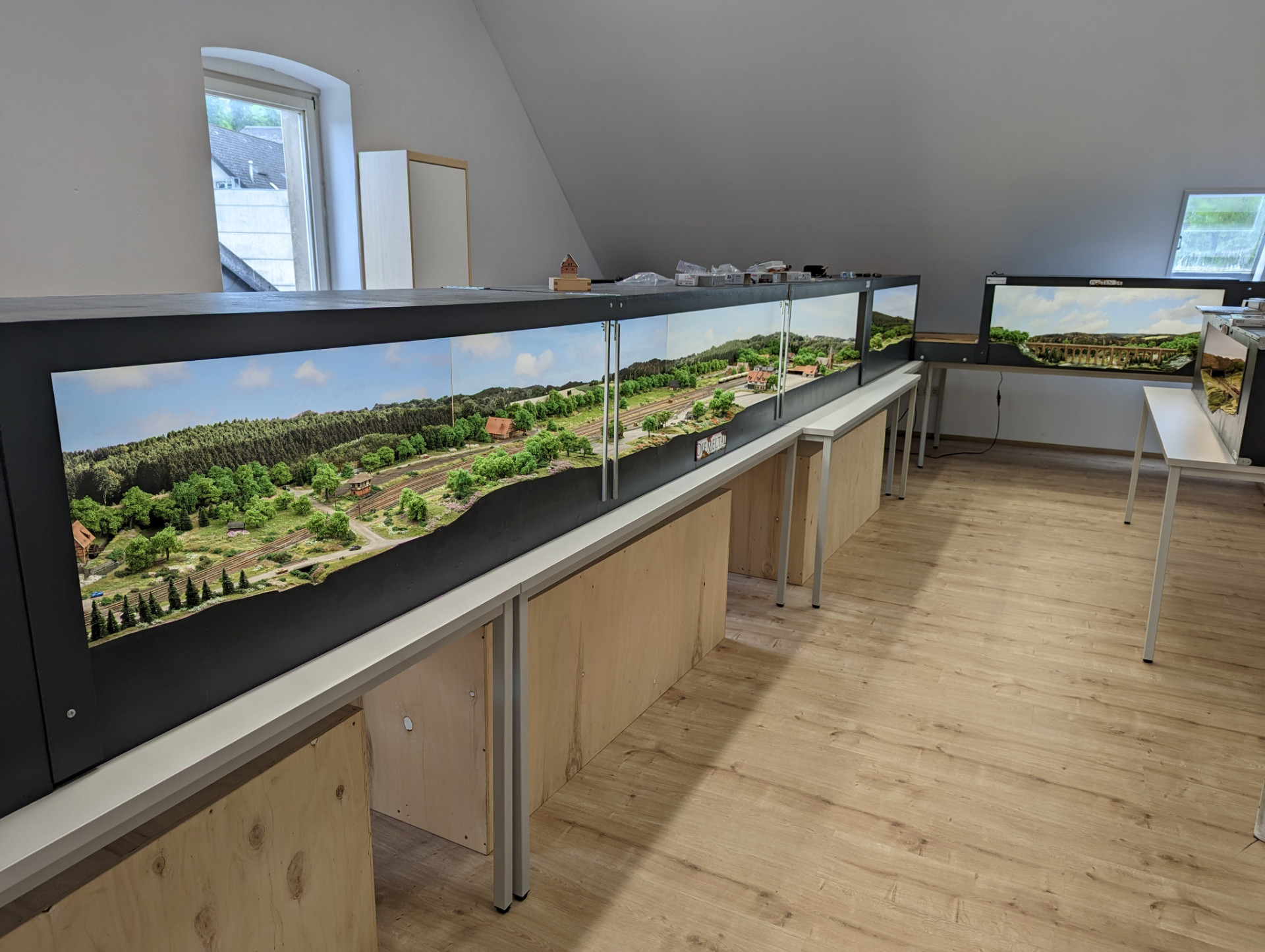 Grundsätzlich ist alles montiert. Es gibt noch einen Fehler in der verkabelung, den suche ich aber heute nicht mehr. Und dann muss noch ein neuer Plan im Traincontroller gezeichnet werden für die Gesamtanlage und ein schöner Fahrplan erstellt werden.
