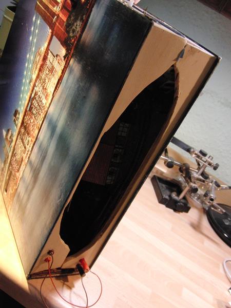 Anlage im Aktenordner, klappbar, Gleisübergänge zum Einsetzen mit Federstahldraht. Ein Gleisoval mit Trafobetrieb. Alle Gebäude aus Karton, beleuchtet.