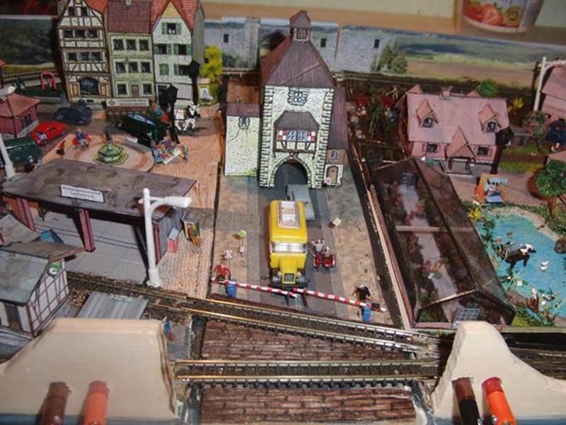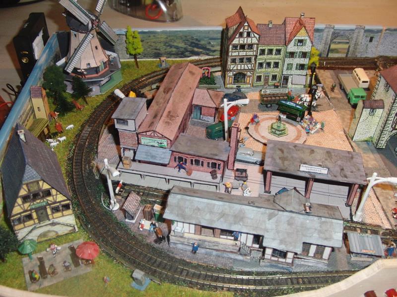 Anlage im Aktenordner, klappbar, Gleisübergänge zum Einsetzen mit Federstahldraht. Ein Gleisoval mit Trafobetrieb. Alle Gebäude aus Karton, beleuchtet.