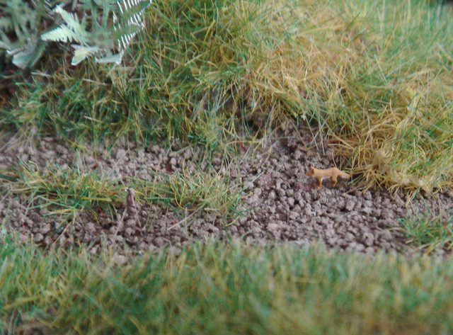Ich plane, diese Szene umzusetzen und zwar auf den Rand der Landstraße. Das soll nicht makaber erscheinen, sondern einfach den Betrachtern helfen. Wo nichts los ist, d.h. nicht ständig Autos fahren, überqueren Wildtiere ja auch die Straße. Makaber darf ich auch deswegen nicht sein, weil es eine besondere Szene für meine Kinder ist. Birgit hat das Häschen, wenn man ganz genau hinschaut, nach der Vorlage unserer Kaninchen gestaltet.