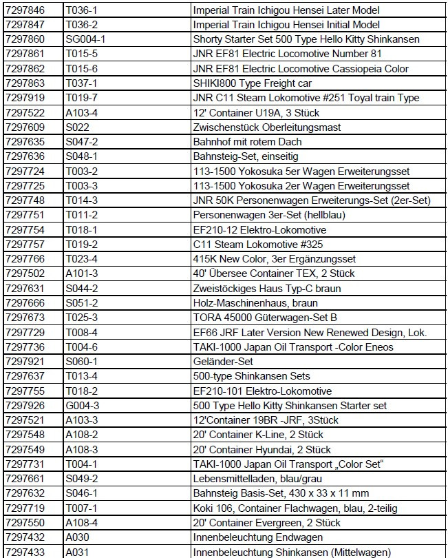 japanisches Rollmaterial wie Loks und Wagen: 6 bis 24 Stück je nach Artikel.