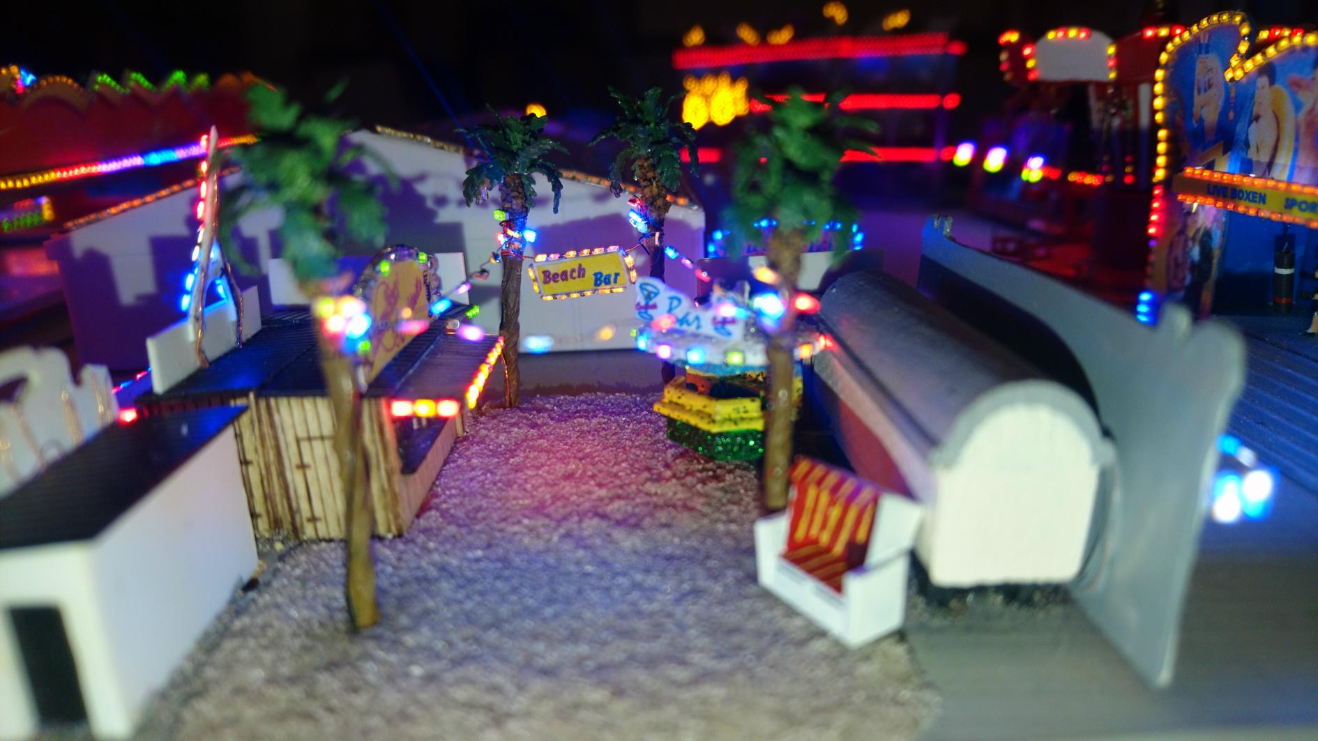 Neu ist die Beach Bar: Vier Palmen mit LED-Strahlern, dazwischen LED-Lichterketten und über dem Eingang ein beleuchtetes “Beach Bar”-Schild, dazu zwei Cocktail-Buden, ein wenig Sand sowie ein Strandkorb ergeben das richtige Strand-Feeling.