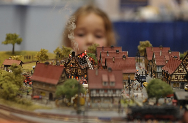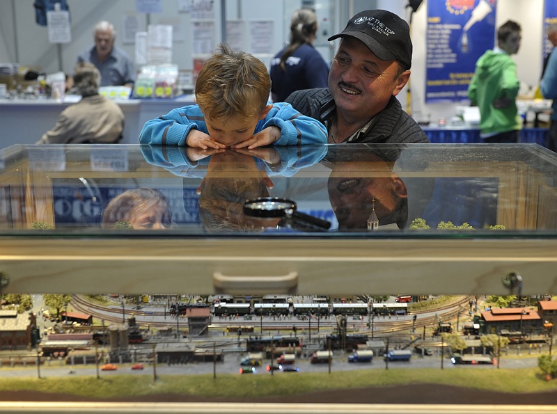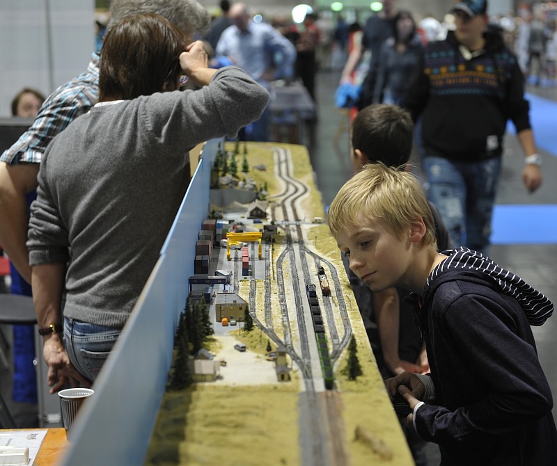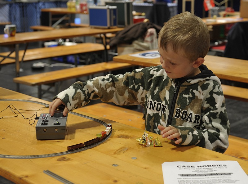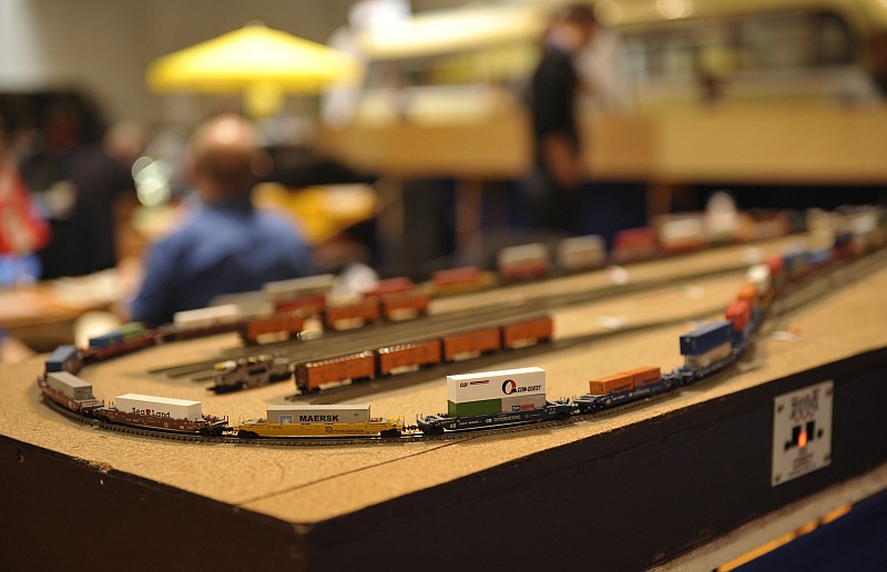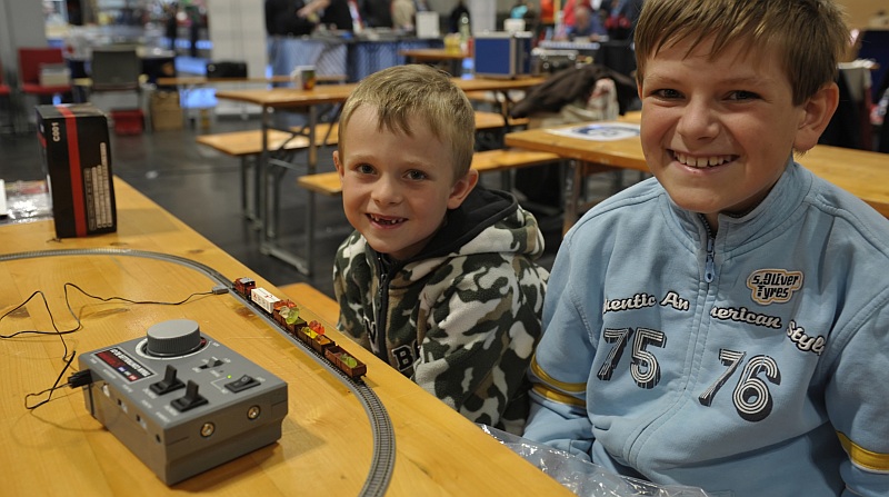 der Gemeinschaftsstand des Wiener und des Bayern-Stammtischs war zumindest ab Samstag immer dicht belagert. Ja, es gab sogar richtige Familienstreits, weil manche Kinder oder Jugendliche nach "nur" einer halben Stunde Handysteuerung an der Bayern-Modulanlage nicht "schon" wieder weitergehen wollten; ähnliches spielte sich an der batteriebetriebenen Rokuhan-"Teststrecke" ab - an die US-Module bin ich selber kaum einmal dran gekommen. Gunnar führte derweil unter den staunenden Augen der Besucher Wartungs- und Reparaturarbeiten an Z-Loks durch; Harald und Hannes waren im Getümmel rund um Drachenstein immer voll beschäftigt, den Fahrbetrieb aufrecht zu erhalten und Fragen zu den zahlreichen Details der Anlage zu beantworten.