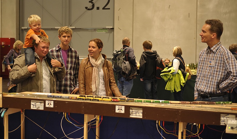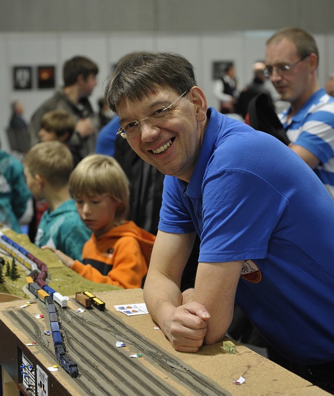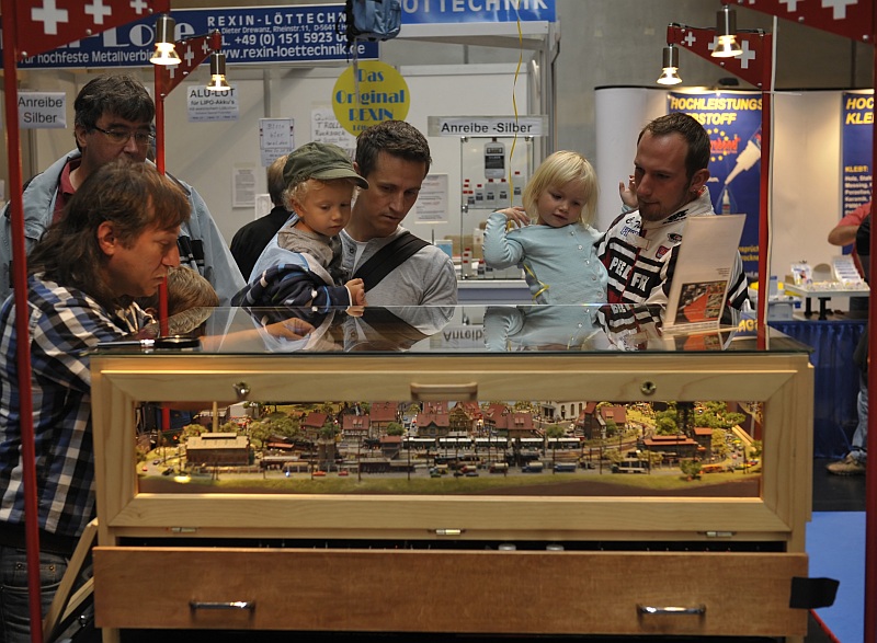 Die Digital-Demoanlage wurde dieses Mal überwiegend von Rainer selbst vorgeführt und lief auch viel zuverlässiger als in GP - ich war ja meistens genügend weit weg ;) . Gerade zum Thema "Z und Digital" war großes Interesse von Neulingen wie von Digital-Profis zu vermelden. Derweil ging es gegenüber am Stand von Roco/Fleischmann meist ruhiger zu - hier gab es ja auch nichts zum Selber-Mitmachen! Wir haben dafür deren Standpersonal immer wieder mal ein paar Details unserer Modulanlage sowie des Rokuhan-Gleissystems erklärt bzw. auch einmal zeigen können, dass man mit der Roco-Multimaus auch Modellbahnen in der einZig richtigen Baugröße betreiben kann...