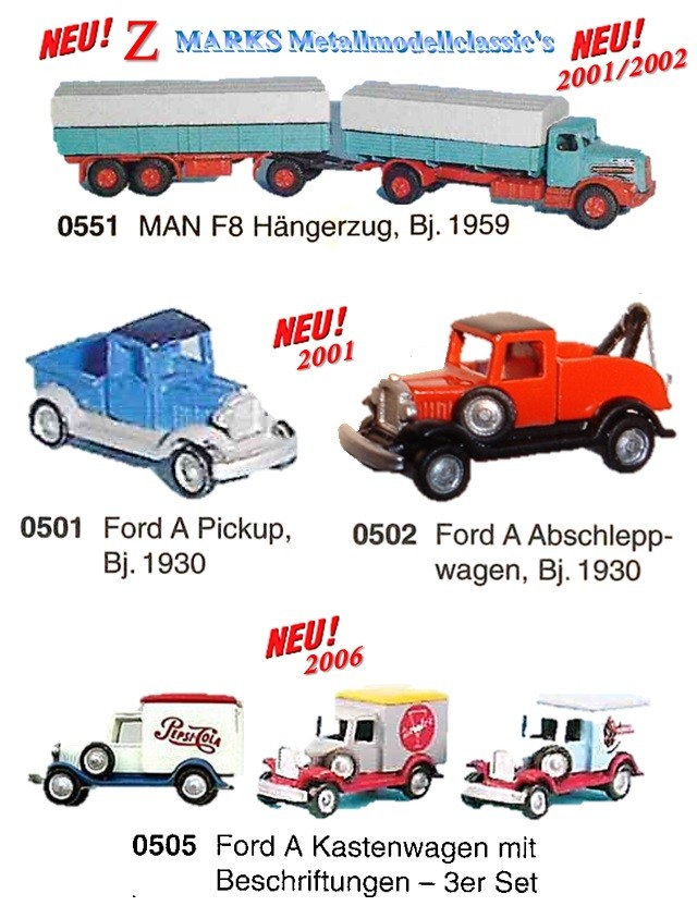 Ab 2001 wagte man sich auch an Modelle im Maßstab 1:220. In Neuheitenprospekten von 2001 bzw. 2002 und 2006 wurden Z-Fahrzeuge angekündigt: Über die Jahre ist der Ford A Abschleppwagen öfter aufgetaucht, von den anderen habe ich nie ein Z-Modell zu Gesicht bekommen. Meines Erachtens wurden die nicht in Serie realisiert, oder hat jemand von euch welche im Besitz?