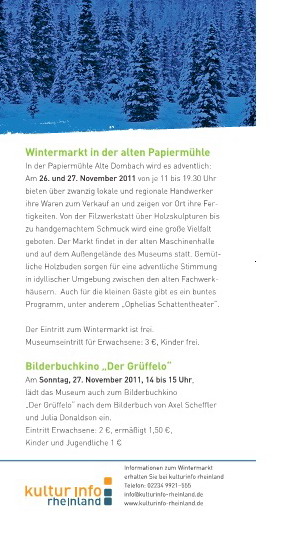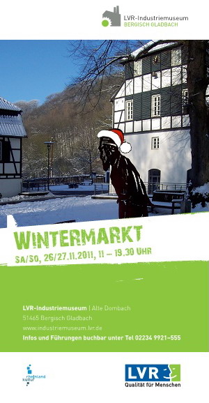 Am Wochenende 26. und 27. November 2011 findet von 11: 00 Uhr bis 19:30 Uhr in Bergisch Gladbach im LVR Industriemuseum in und vor der fast 400 Jahre alten Papiermühle Alte Dombach ein Wintermarkt statt. Regionale Handwerker mit Filzwerkstatt, Holz- und Steinskulpturen stellen dort weihnachtliche Stimmungsmacher und potenzielle Geschenke aus.