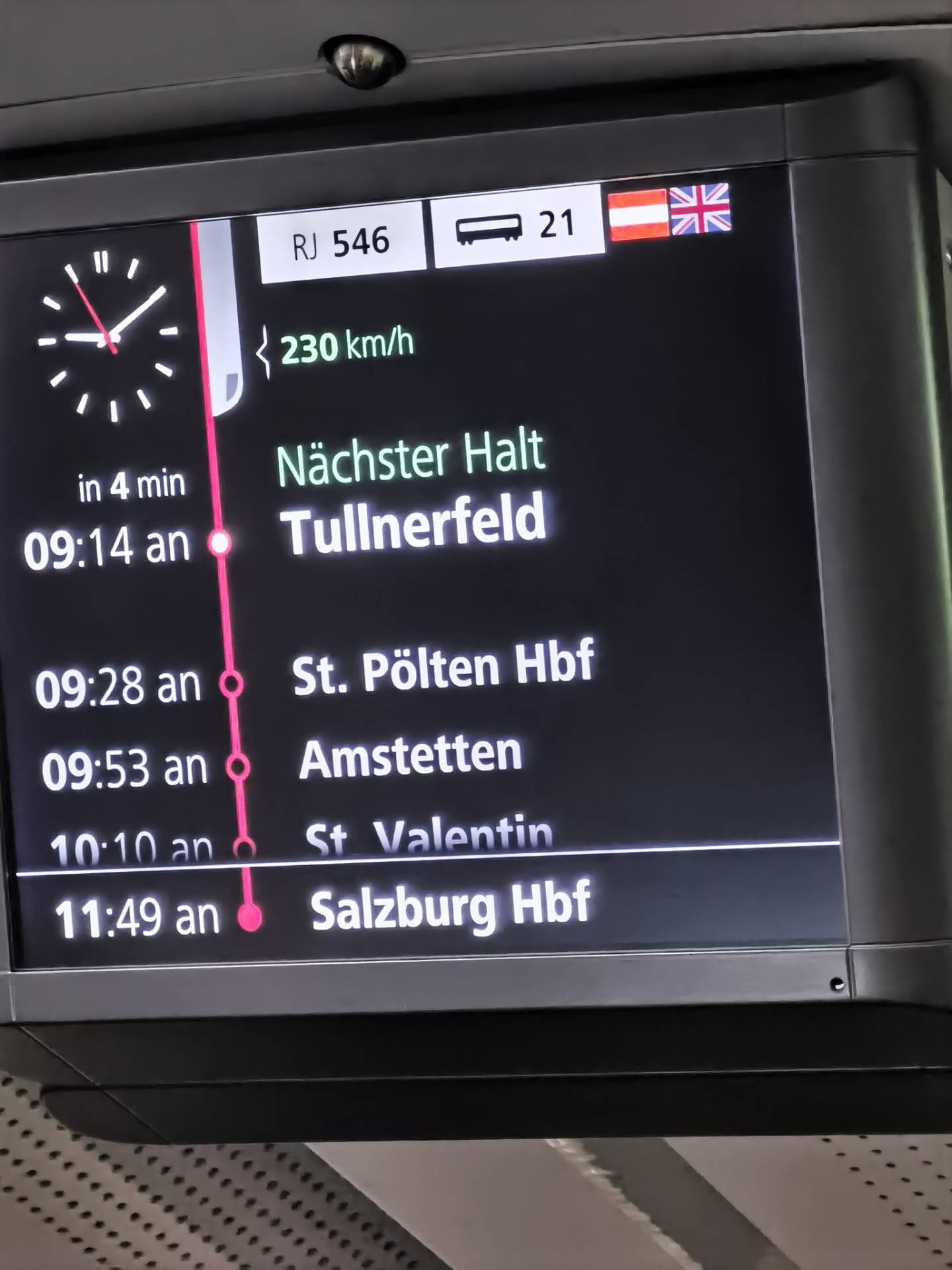 Unschwer ist zu erkennen, dass wir auf der Zufahrt nach Tullnerfeld mit einer Momentangeschwindigkeit von 230 km/h unterwegs waren. Übrigens mit bestem Fahrkomfort und druckertüchtigten Wagen des RailJet.